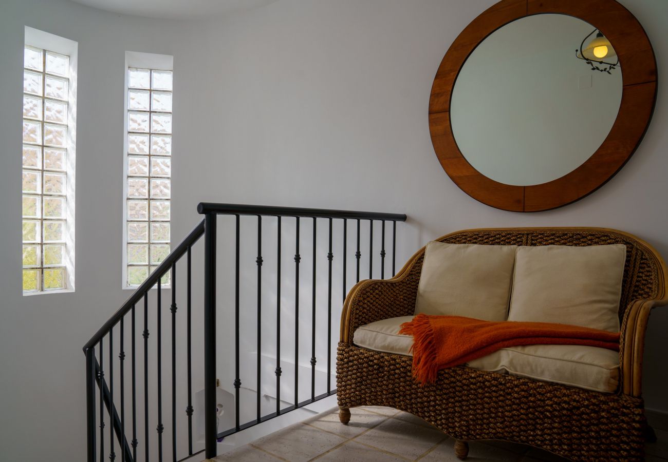También tiene salón comedor en desnivel divididos por una preciosa chimenea (solo decorativa). En la zona del salón encontramos un cómodo sofá, TV, internet fibra 300 MB y una imponente escalera tipo caracol. En la zona del comedor podemos encontrar una mesa para 10 comensales. Desde el salón accedemos a otra planta donde encontraremos el otro dormitorio dobles cama de 140x200 con baño en suite, mas un aseo extra. Además de amplios ventanales con salida directa a la gran terraza. ¡Desde allí las vistas al jardín y al valle del Guadalhorce son increíbles!