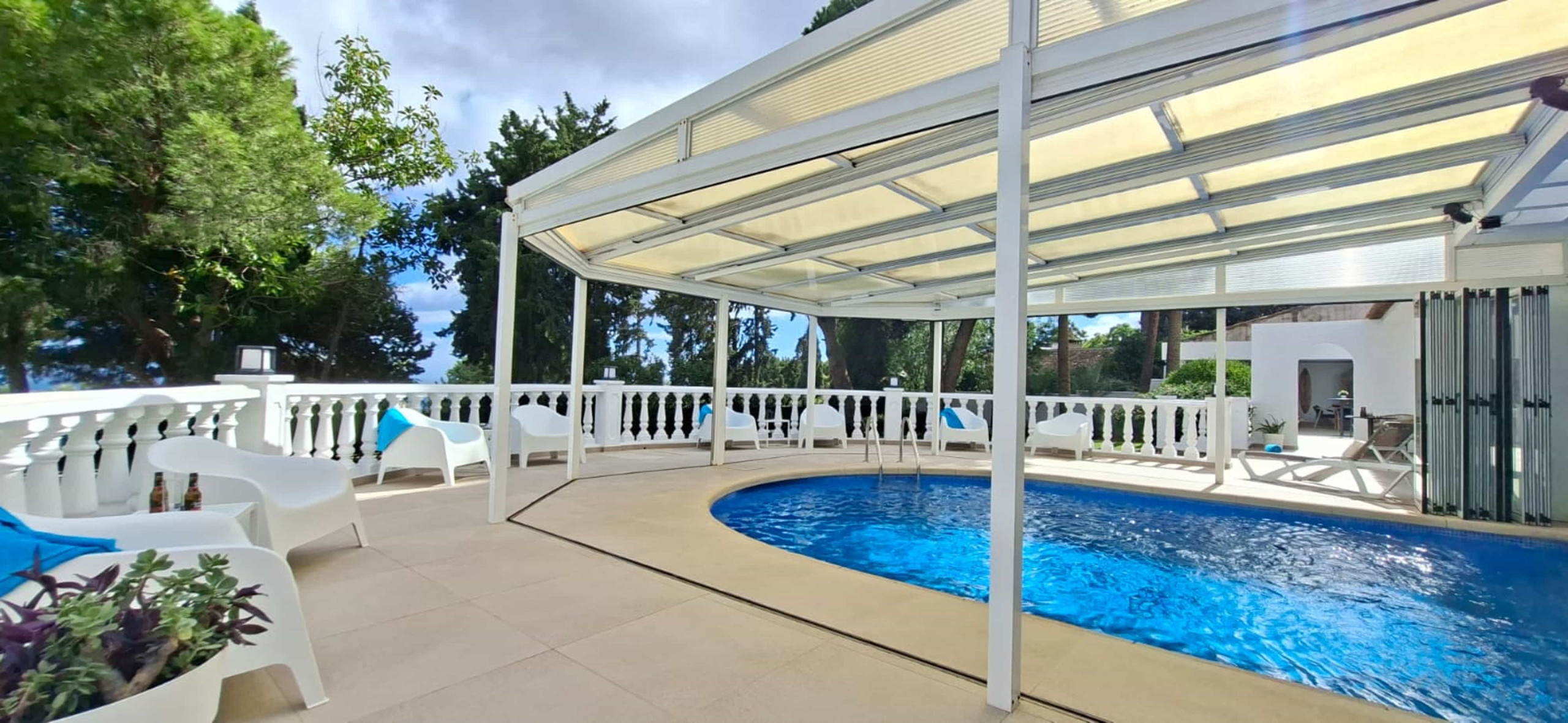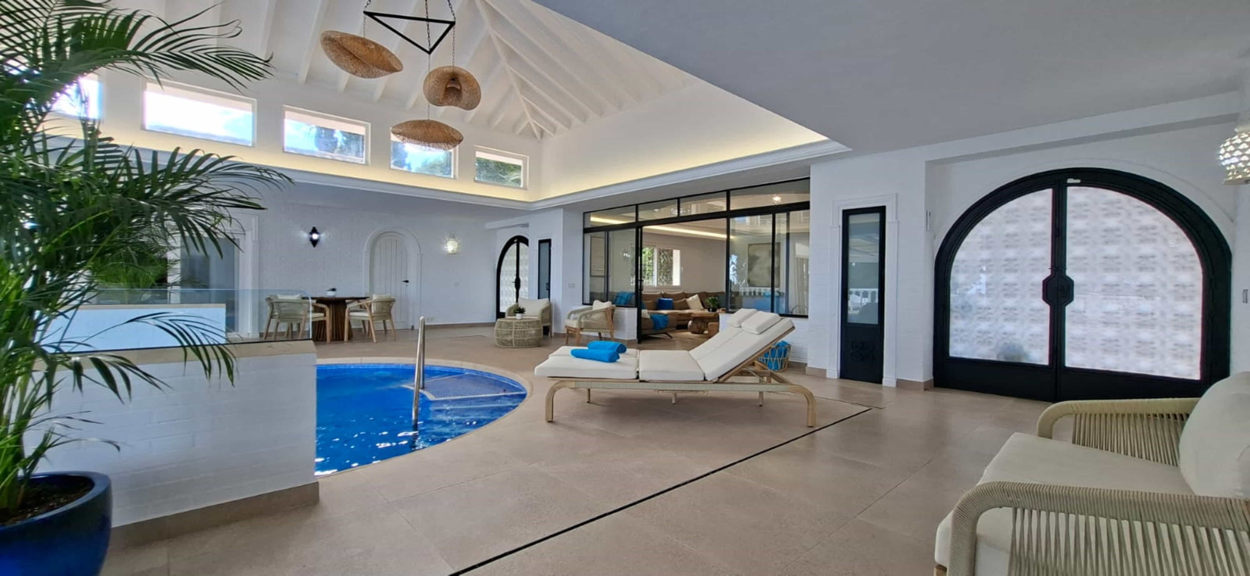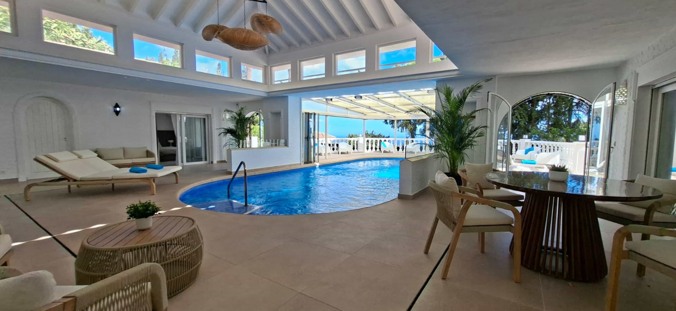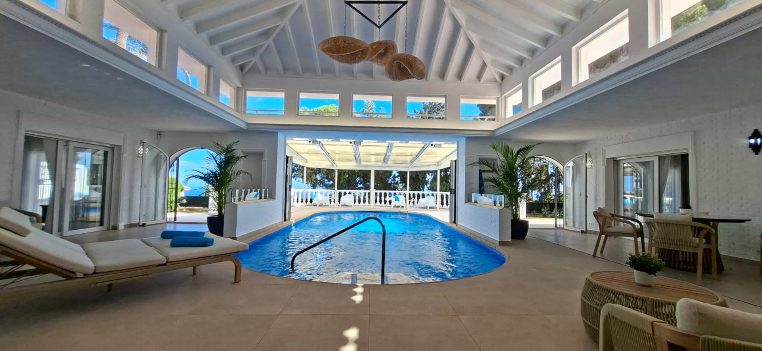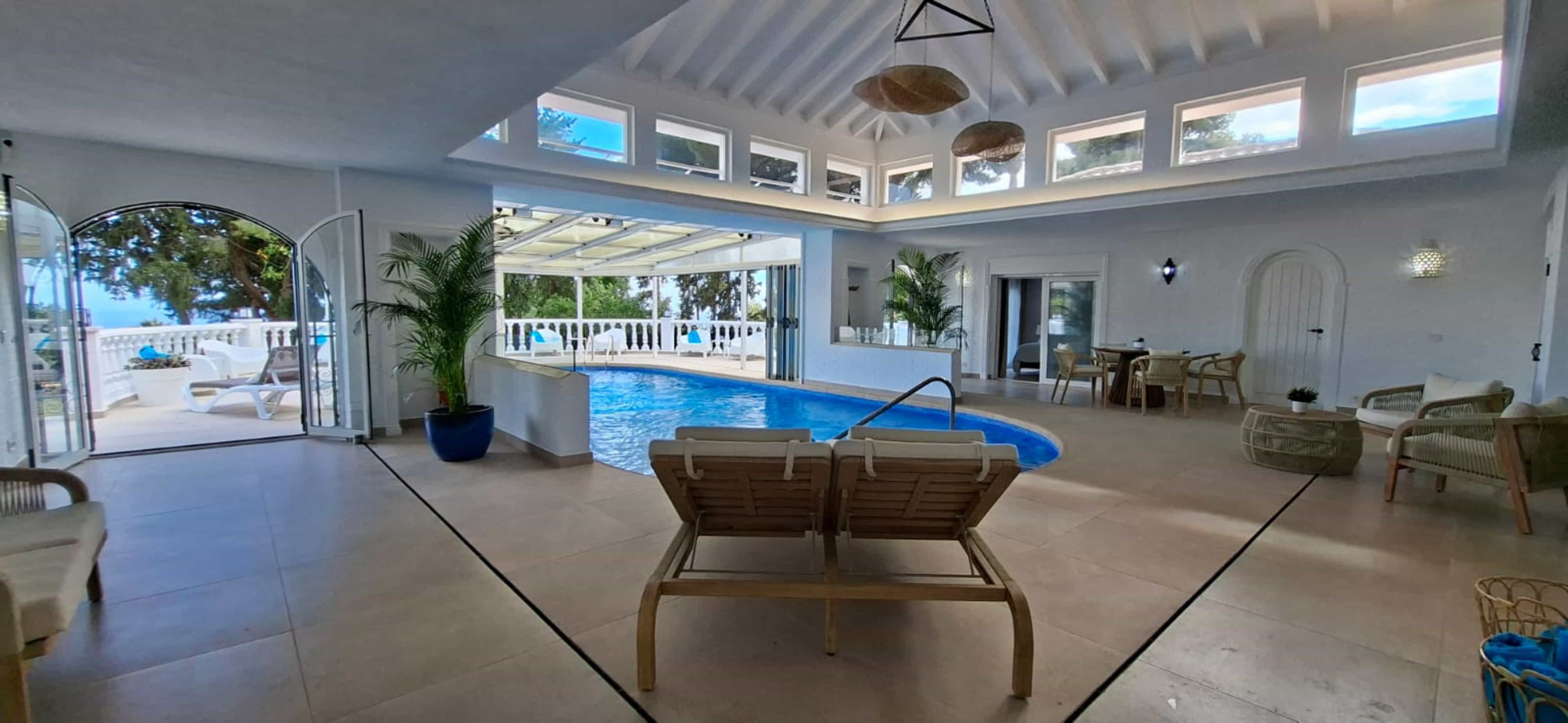 Piscina climatizada y cubierta con acceso directo desde la villa, puede asegurarse bajo petición