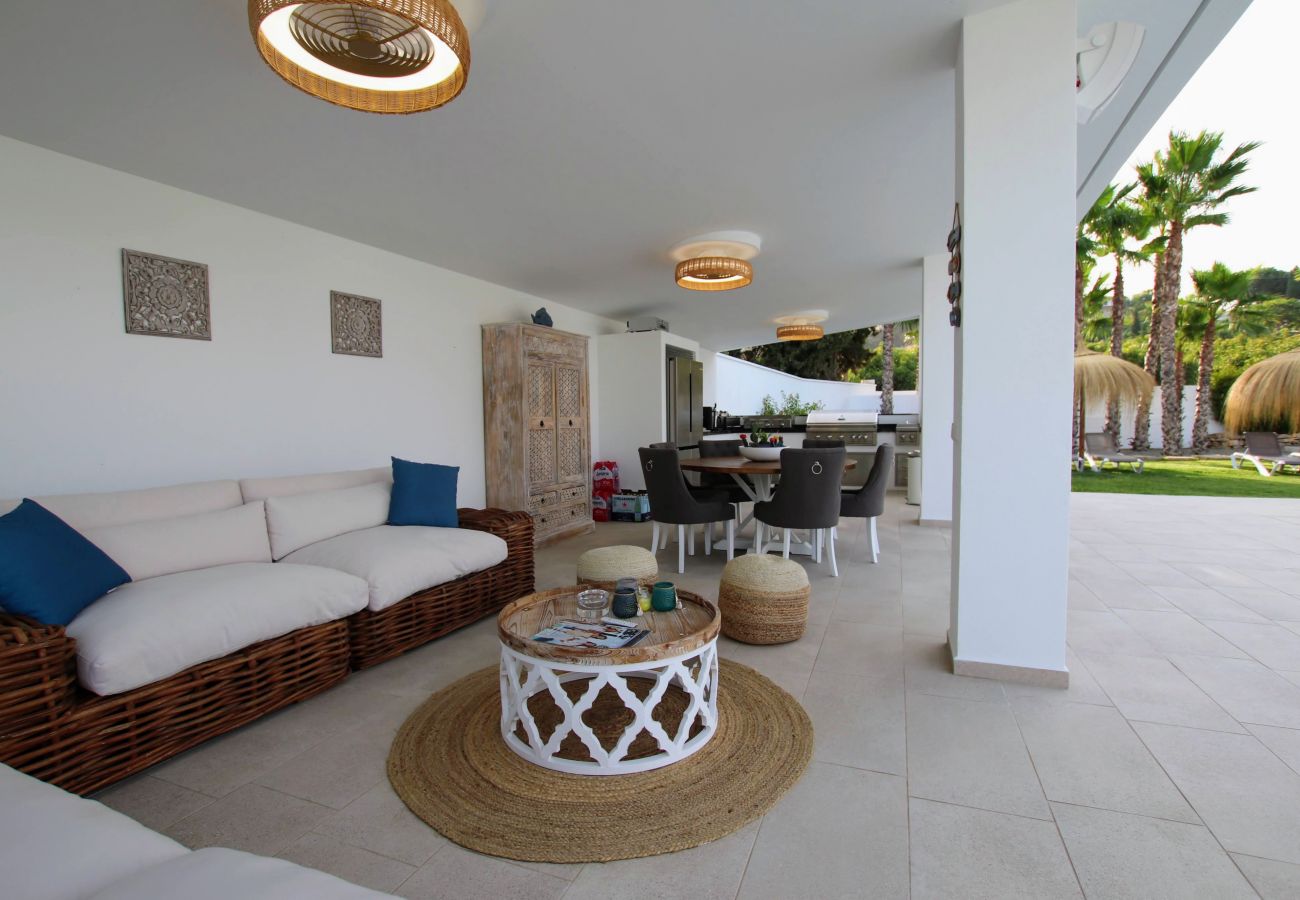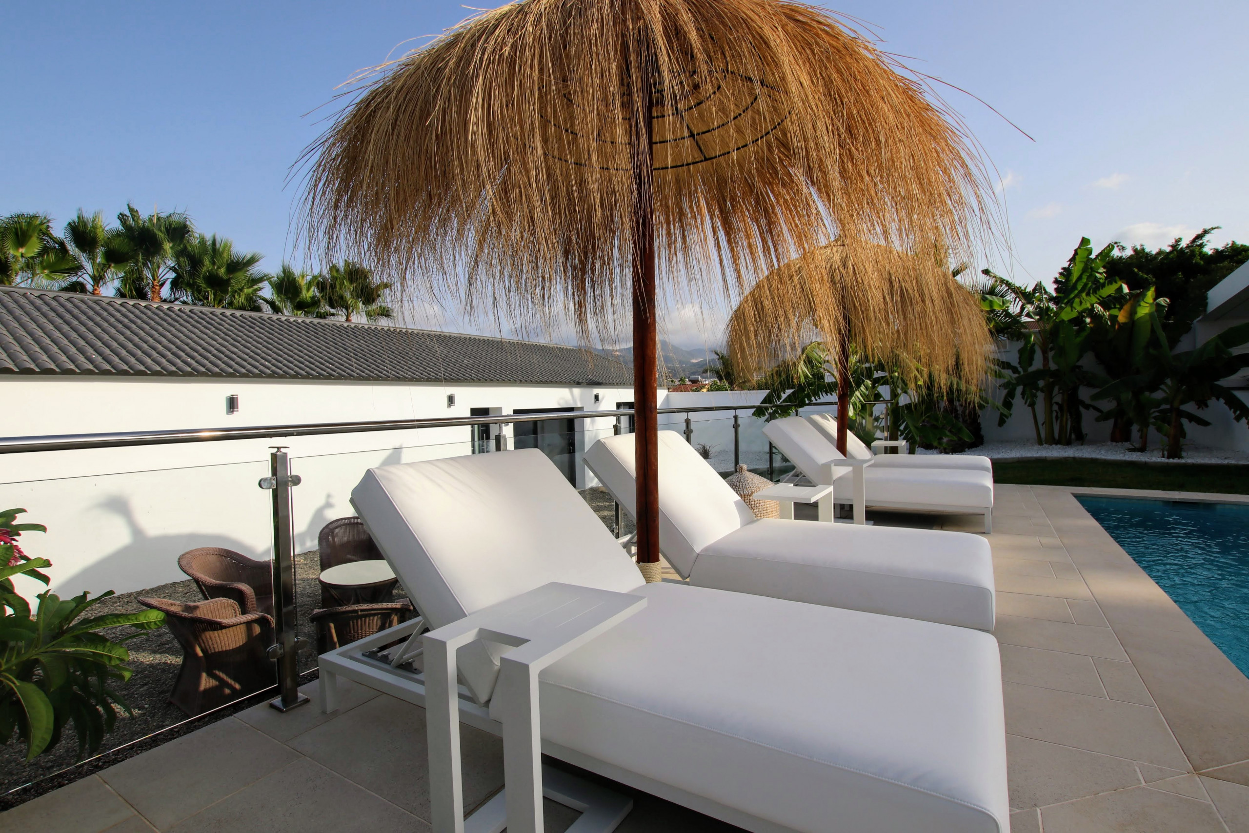 - Multiple seating areas with sofas and sun loungers