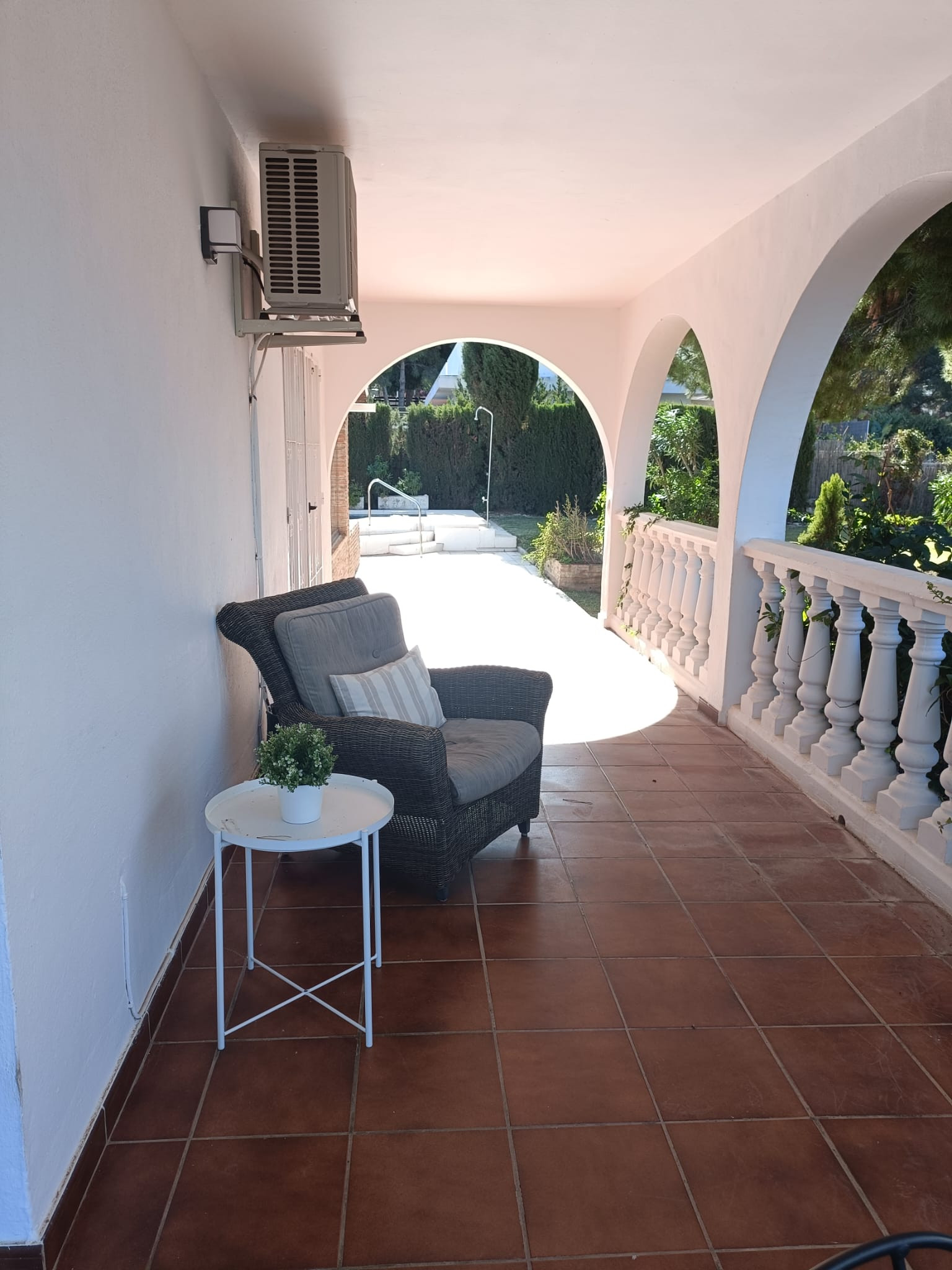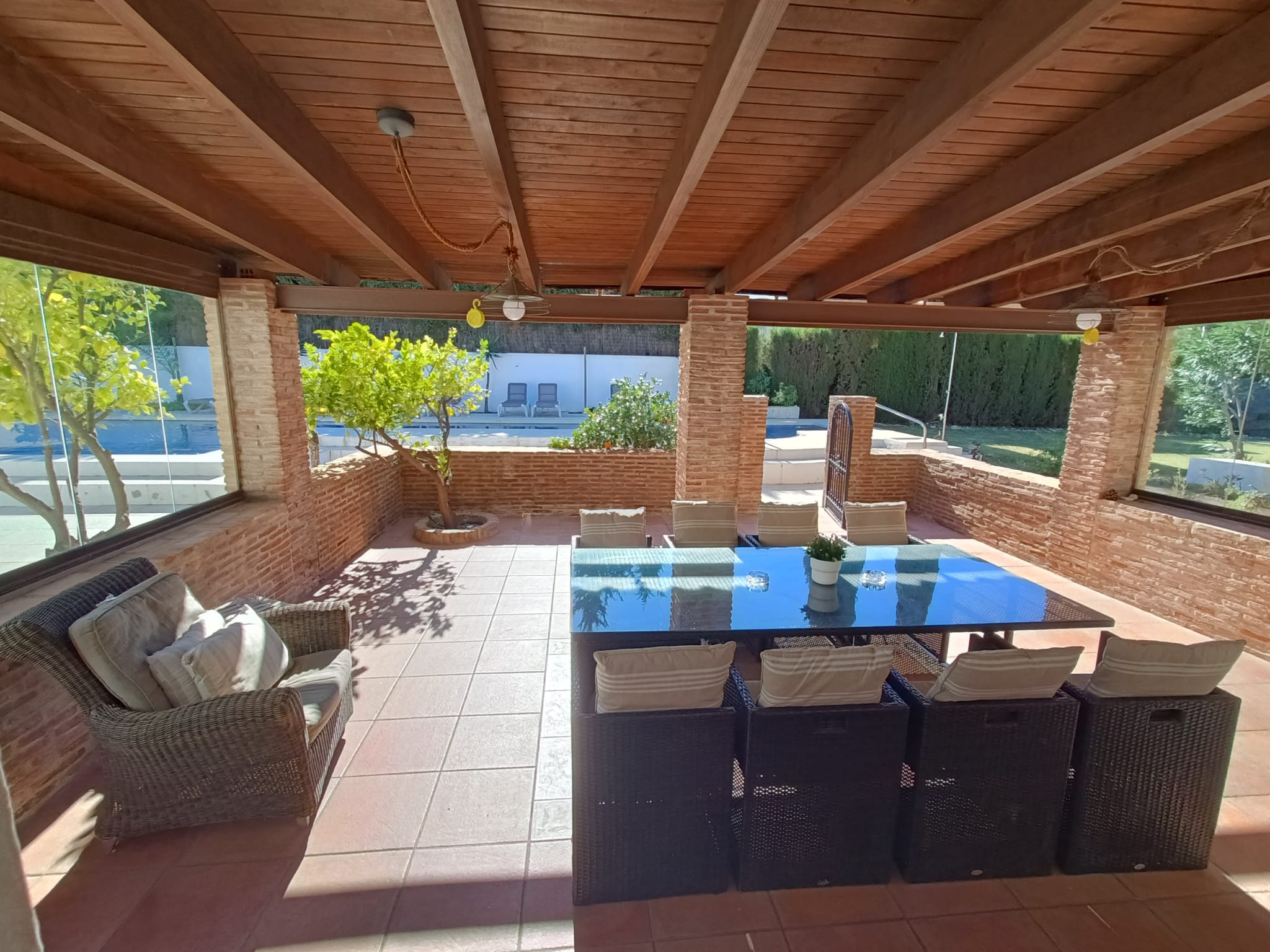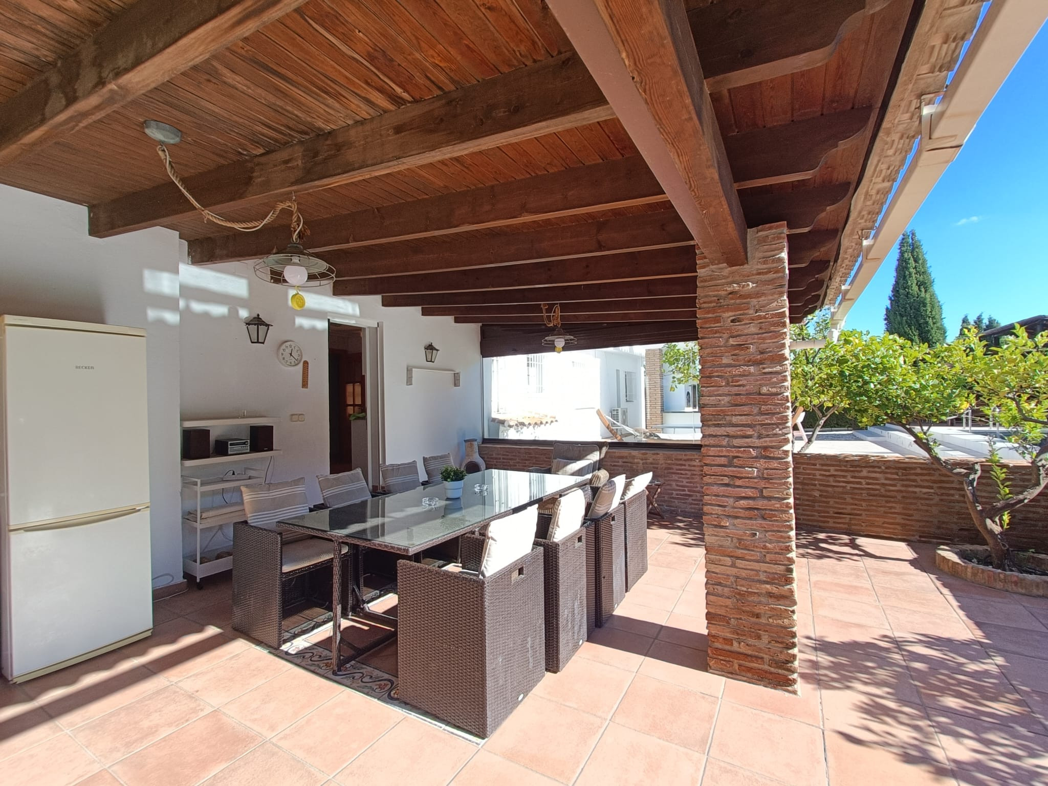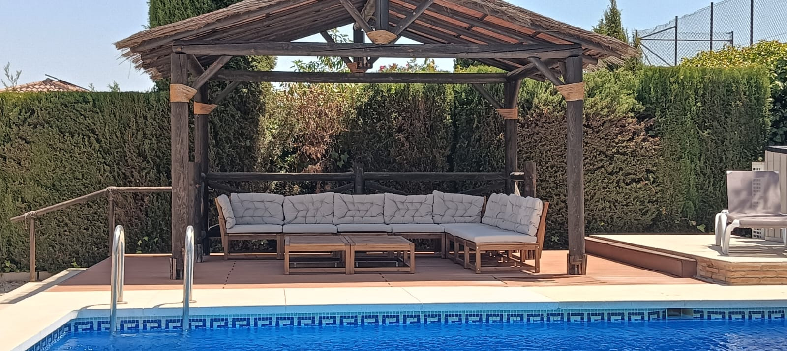 The exterior of Villa Andalucía is a paradise in itself. The extensive garden surrounds the house and provides a tranquil and relaxing environment. You'll find a charcoal barbecue area perfect for al fresco dining with friends and family, an outdoor dining area that can accommodate 10 guests, a cozy chill-out area for relaxation and unwinding, and a stunning L-shaped pool, that is perfect for cooling off and basking in the warm Andalusian sun.