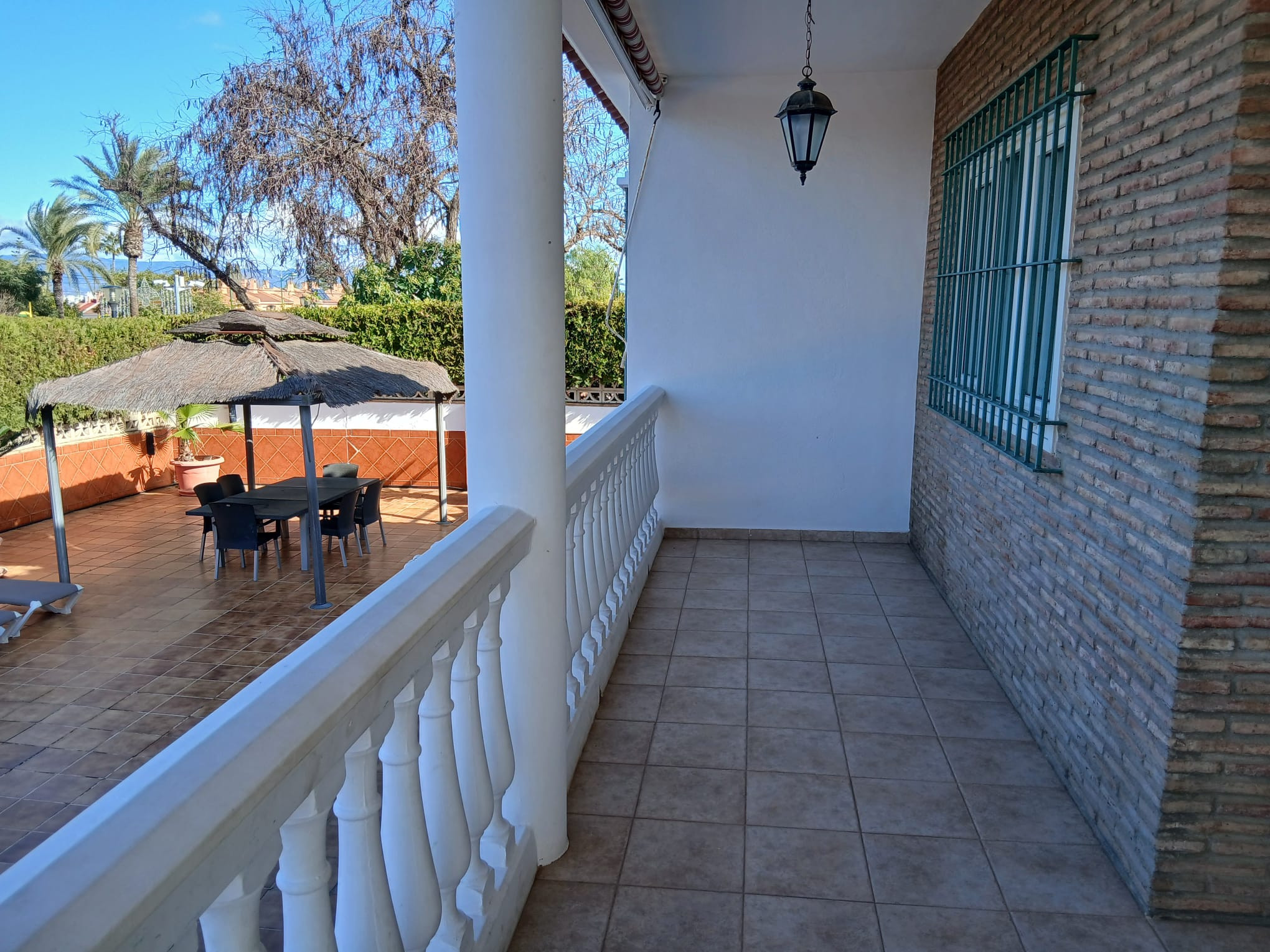 The exterior of Villa Andalucía is a paradise in itself. The extensive garden surrounds the house and provides a tranquil and relaxing environment. You'll find a charcoal barbecue area perfect for al fresco dining with friends and family, an outdoor dining area that can accommodate 10 guests, a cozy chill-out area for relaxation and unwinding, and a stunning L-shaped pool, that is perfect for cooling off and basking in the warm Andalusian sun.