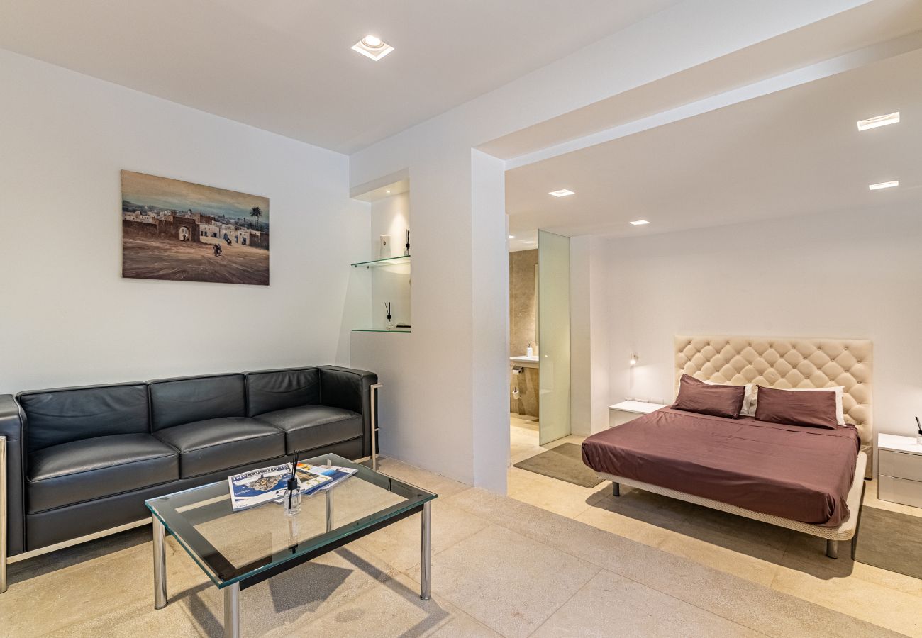 * Bedroom C: spacious bedroom with views of the garden with a double bed, TV, air conditioning, radiator and several wardrobes for clothing organisation. Additionally, there is a small living room with TV, sofa and a kitchenette with fridge, sink, coffee maker, kettle and cutlery. En-suite bathroom with air conditioning, radiator, washbasin, WC and shower.