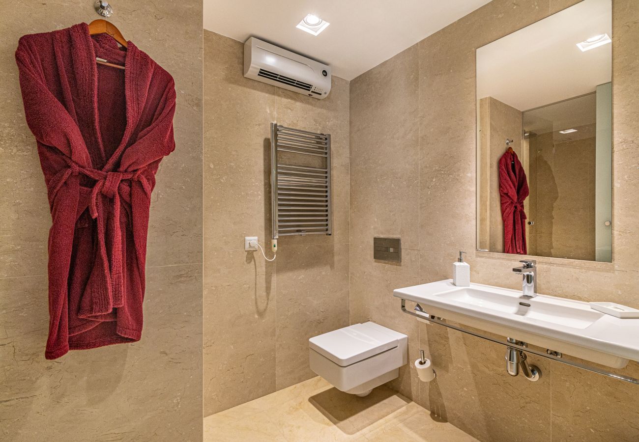 * Bedroom E: has a double bed, TV, ceiling fan and radiator. For clothing organisation, there is a walk-in wardrobe with 2 doors. En-suite bathroom with A/C, radiator, sink, mirror and shower.