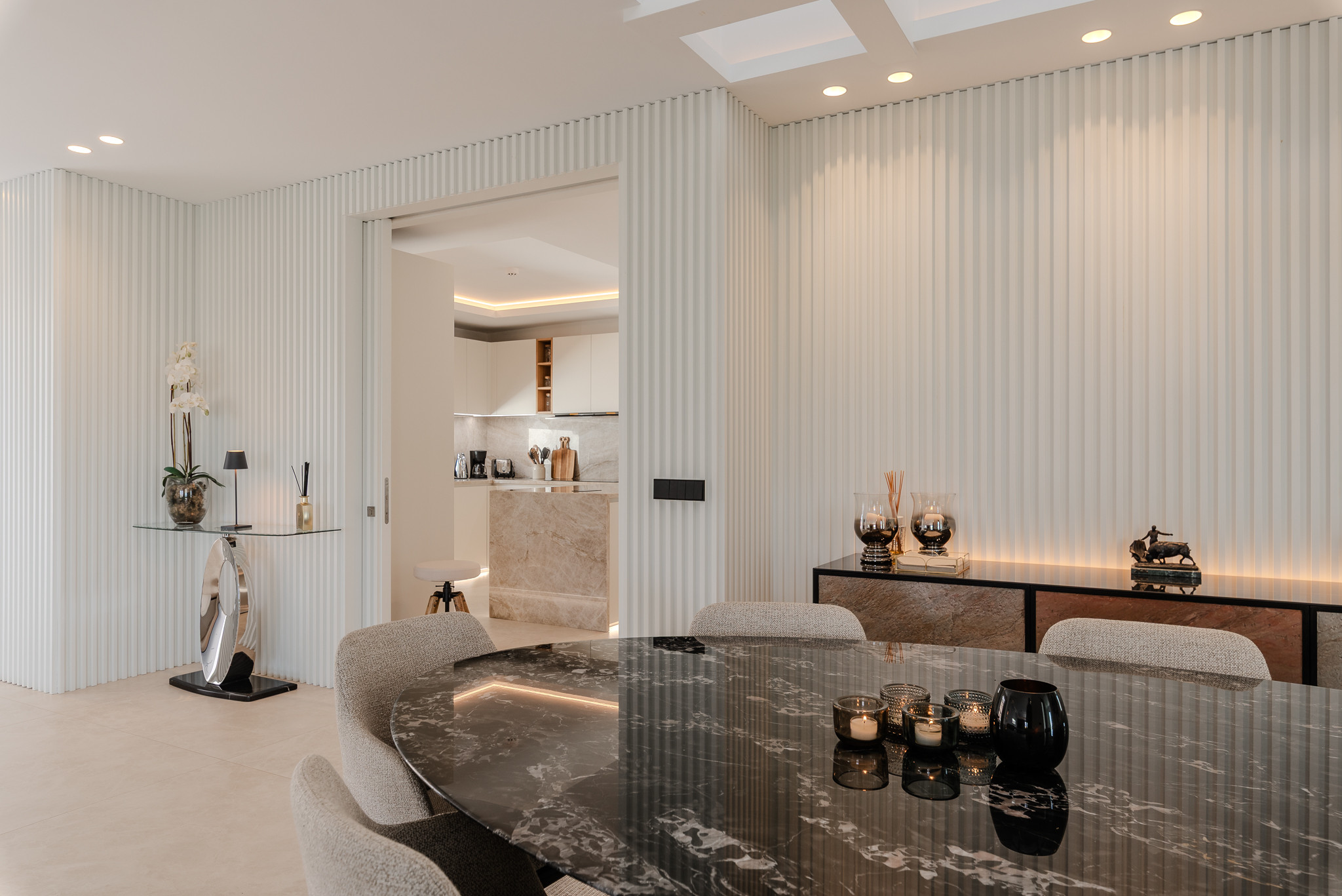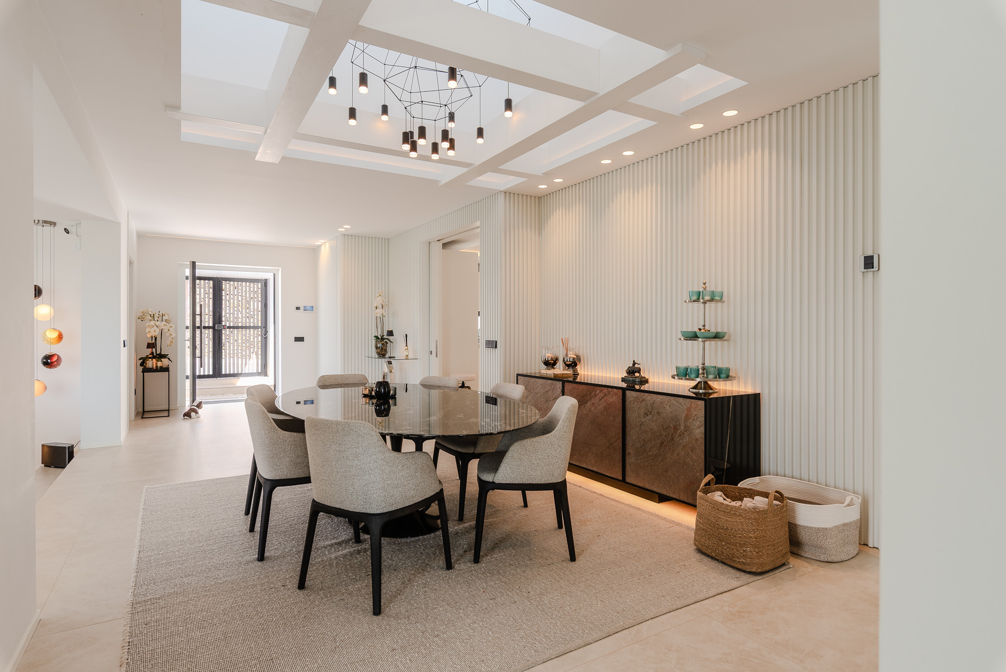 Upon entering the villa, you are welcomed by a spacious entrance hall leading directly into a bright and elegant dining area.