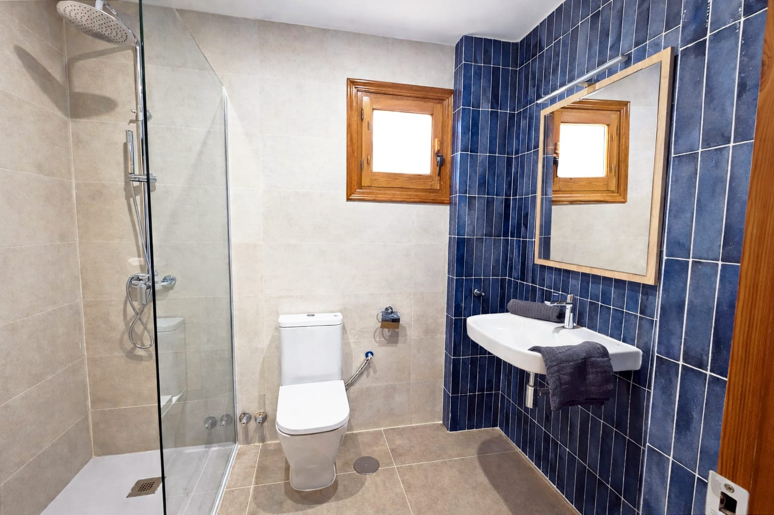 Au rez-de-chaussée se trouvent trois chambres doubles : deux d'entre elles disposent d'une salle de bain privative en suite, et la troisième a une salle de bain juste à côté. À l'étage supérieur se trouve la quatrième chambre, équipée de deux lits superposés, idéale pour les enfants ou les groupes d'amis. Important : la salle de bain la plus proche de cette chambre se trouve à l'étage inférieur.