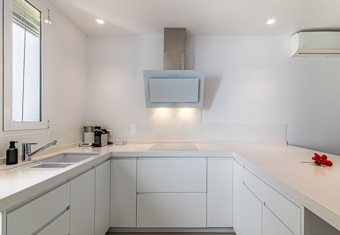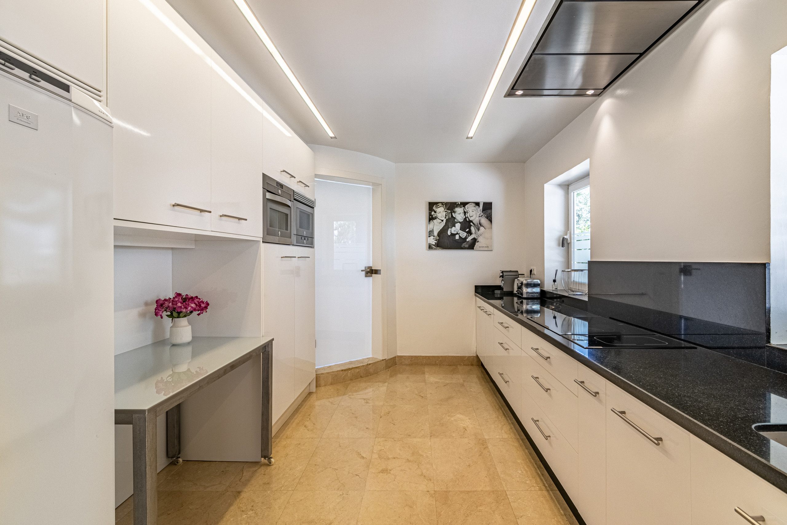 * Cuisine : un espace parfait pour mettre en pratique vos meilleures recettes. Il dispose d'un beau plan de travail avec une plaque vitrocéramique, un four, une hotte, un réfrigérateur, un congélateur, un micro-ondes, un lave-linge, une cafetière, un grille-pain, un presse-agrumes, une vaisselle complète et des couverts. Il est à noter que tous les appareils électroménagers sont de haute qualité et en parfait état de fonctionnement. Cet espace est combiné avec une zone de détente avec TV, canapé deux places, climatisation et ventilateur de plafond.