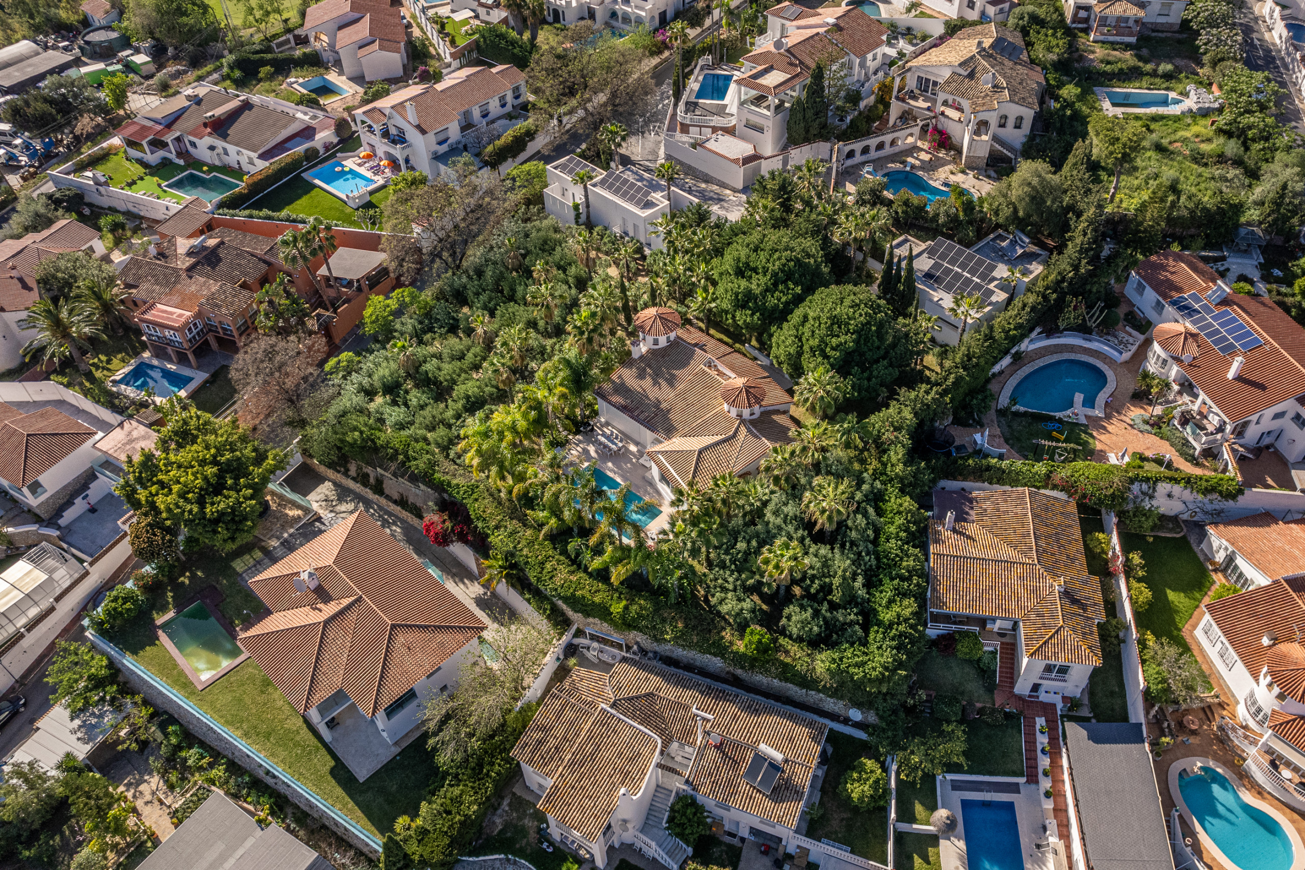 Cette propriété est construite sur une surface d'environ 3 000 m², entourée d'espaces verts luxuriants et de bosquets, principalement des palmiers, des oliviers et des conifères. Elle s'élève à 160 mètres au-dessus du niveau de la mer, offrant une vue panoramique sur la Méditerranée et le mont Calamorro.