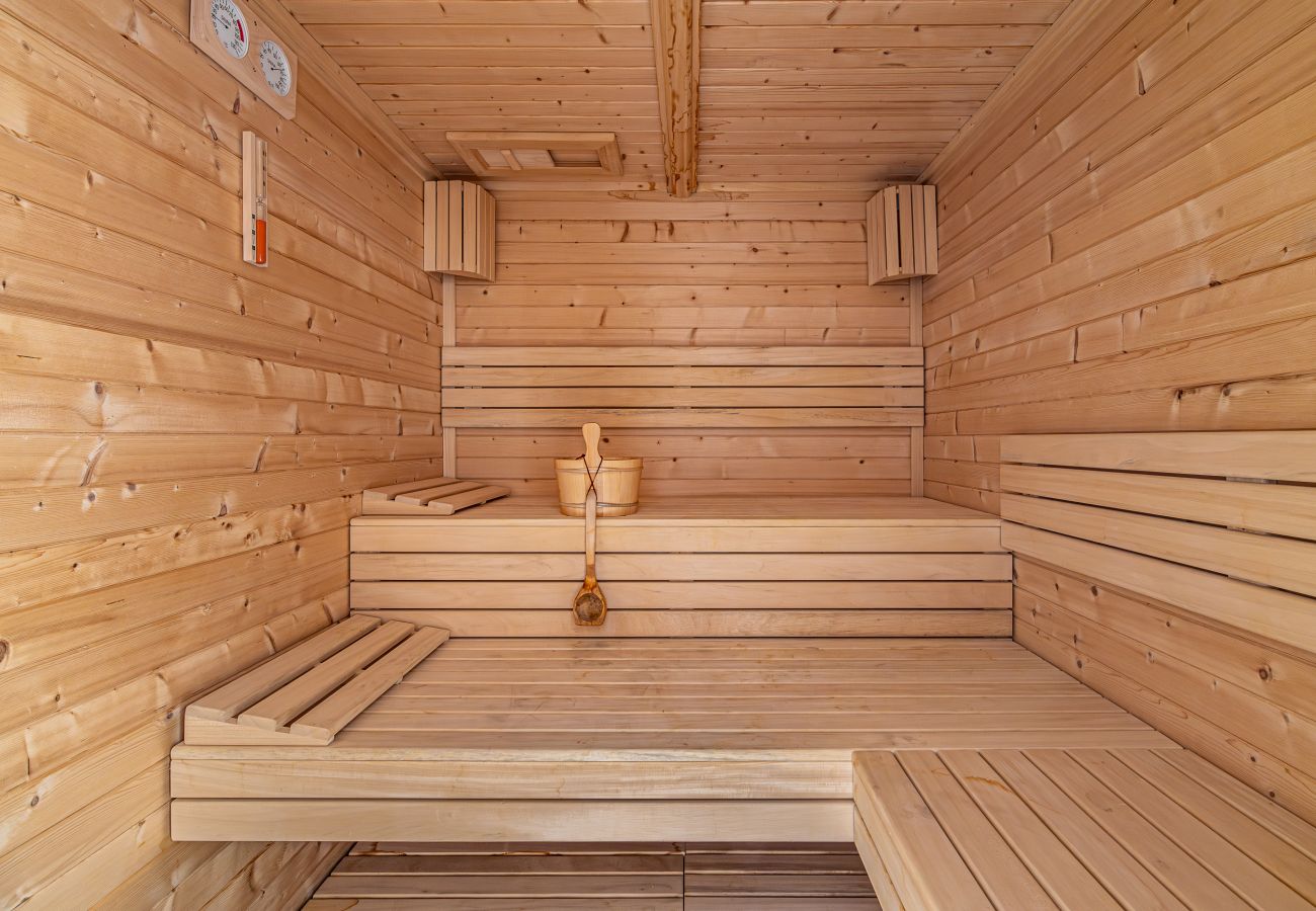 * Chambre D : une grande chambre avec un lit double, TV et bureau, avec accès à un sauna agréable et fonctionnel avec salle de bain attenante avec climatisation, radiateur, lavabo, toilettes et douche.
