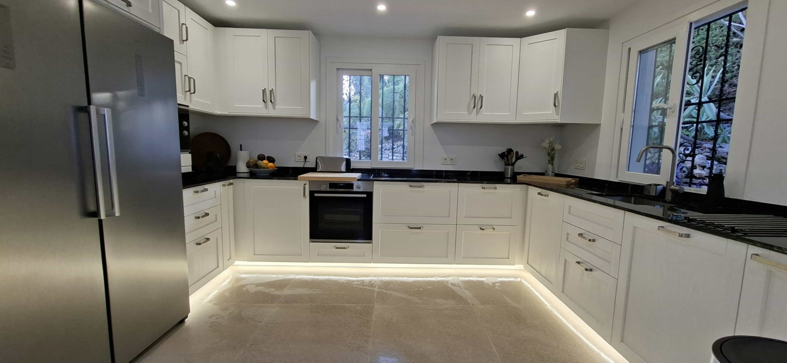 Cuisine intérieure équipée (2 réfrigérateurs, four, plaque induction, micro-ondes, lave-vaisselle, machine à café, presse-agrumes, grille-pain, bouilloire, vaisselle 16 pers