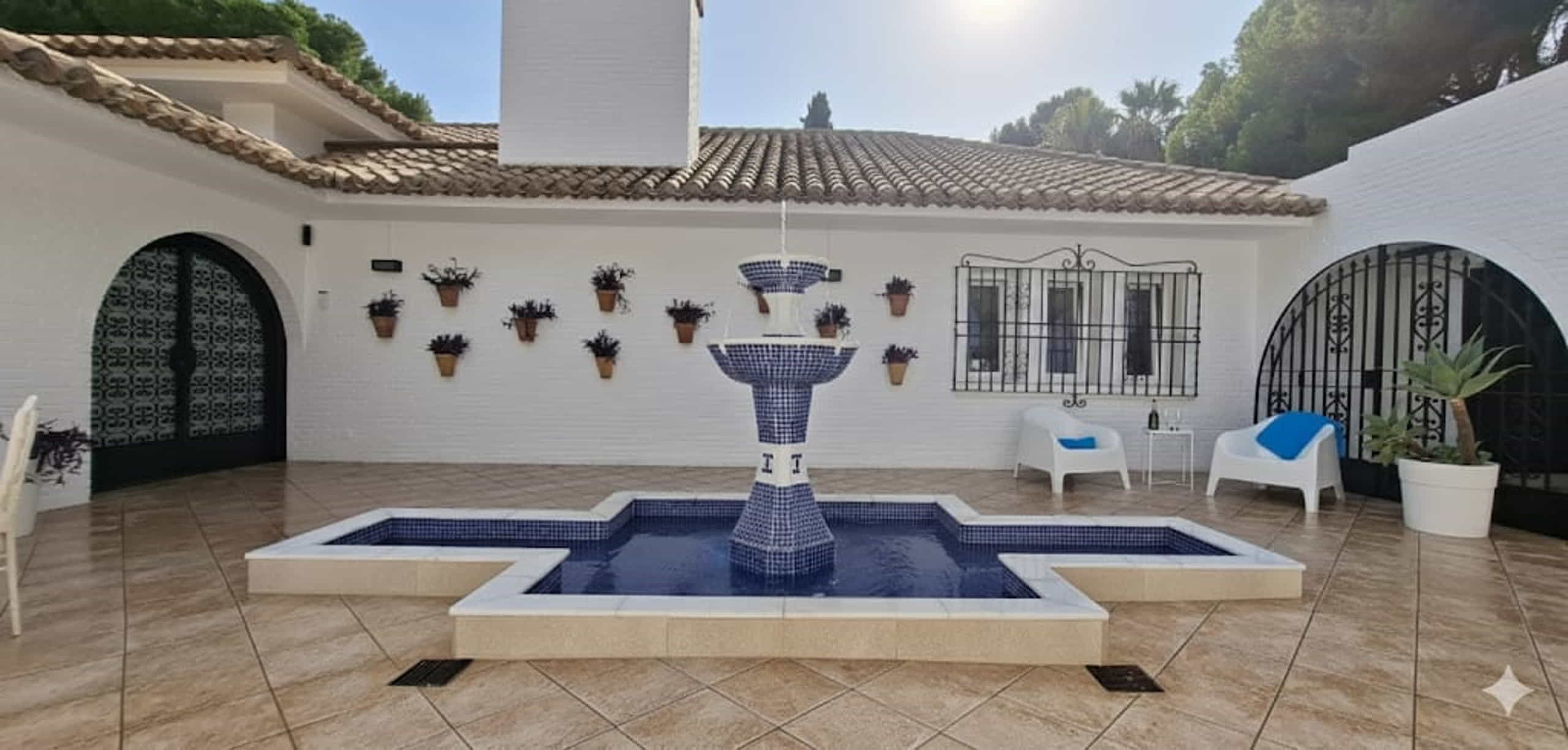 Jardin méditerranéen sans vis-à-vis & patio andalou avec fontaine