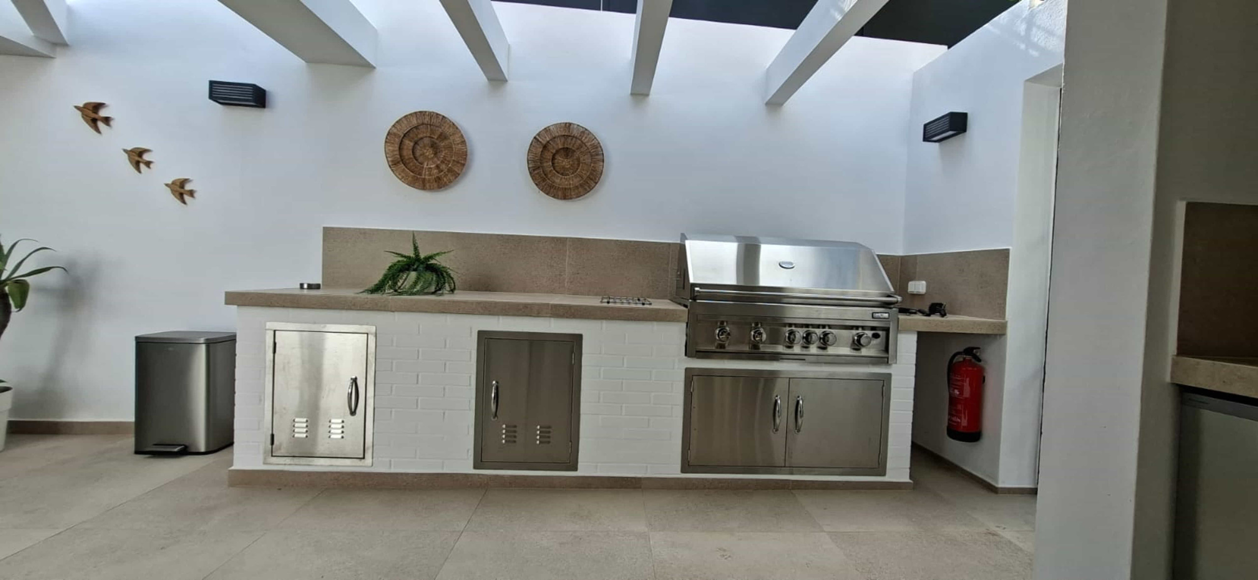 Cuisine d’été (terrasse couverte) avec grand barbecue à gaz, plaque induction, micro-ondes réfrigérateur/congélateur, lave-vaisselle, machine à café, presse-agrumes, grille-pain, bouilloire, vaisselle 16 pers.